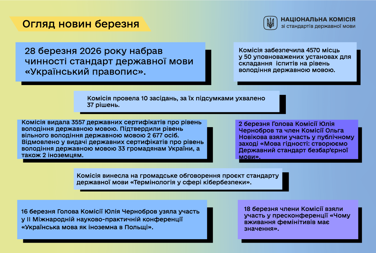 Головне! Після ухвалення Кабінетом Міністрів України постанови від 27 березня 2026 року № 398 «Про визнання такою, що втратила чинність, постанови Кабінету Міністрів України від 22 травня 2019 року № 437» 28 березня набрав чинності стандарт державної мови «Український правопис», затверджений рішенням Комісії від 1 березня 2026 року № 47. Текст цього стандарту опублікований на офіційному вебсайті Комісії.